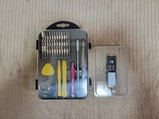 今回増設用に用意したAcerのGen4ハイエンドSSD(Predator M.2 SSD 2TB GM6 NVMe2.0 2280 PCIe Gen4×4)と、作業用の工具一式です。PCの分解には、適切なサイズのプラスドライバーに加え、後述する理由により「精度の高いマイナスドライバー」を用意しておくことを強く推奨します。