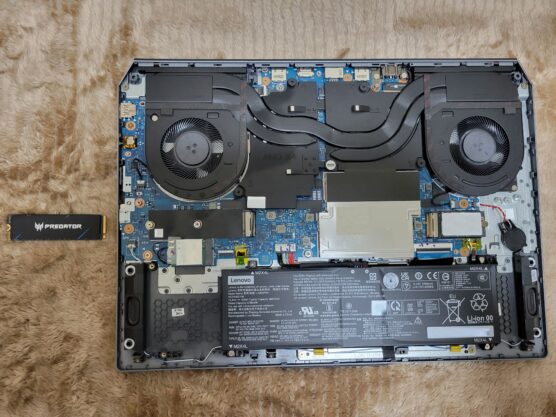 本体裏面のネジを外し、裏蓋を開封します。ここまでは一般的なノートPCの分解手順と同様であり、特筆すべき難点はありませんでした。マザーボード上には空きのM.2スロットが用意されており、ここに新しいSSDを組み込みます。