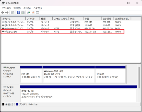 無事にWindowsが起動した後、「ディスクの管理」を開いて新しいSSDをフォーマットし、Dドライブとして割り当てを行いました。