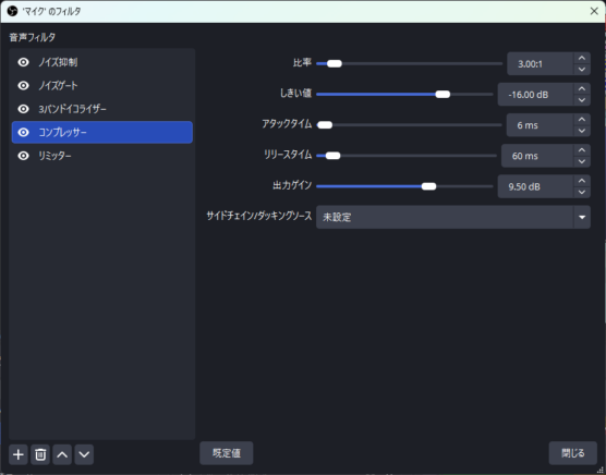 OBSの「音声ミキサー」の歯車アイコン > 「フィルタ」から順に追加・設定してください。 ※上から順に適用されるため、この順番で設定することが重要です。