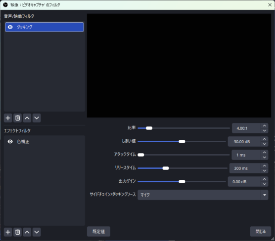 ※注意:このフィルタは「マイク」ではなく、「ゲーム音が鳴っているソース」に追加します。
