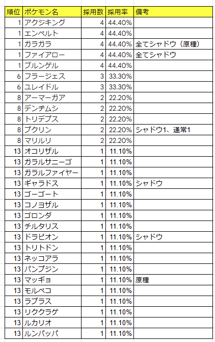まずは気になる「どんなポケモンが多かったの?」というデータから。 参加者9名、合計54匹のポケモンを集計し、採用率ランキングを作成しました。