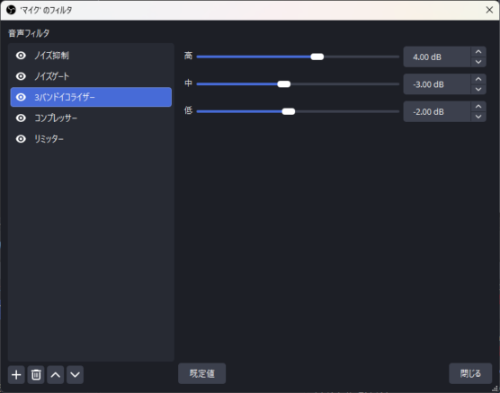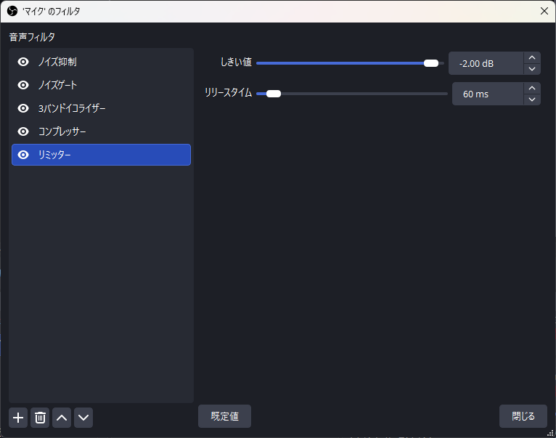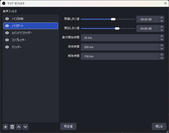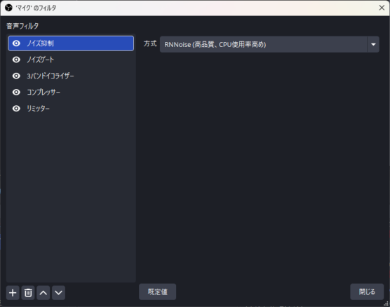 私の環境(2026年1月時点)での決定版設定です。 OBSの「音声ミキサー」の歯車アイコン > 「フィルタ」から順に追加・設定してください。 ※上から順に適用されるため、この順番で設定することが重要です。