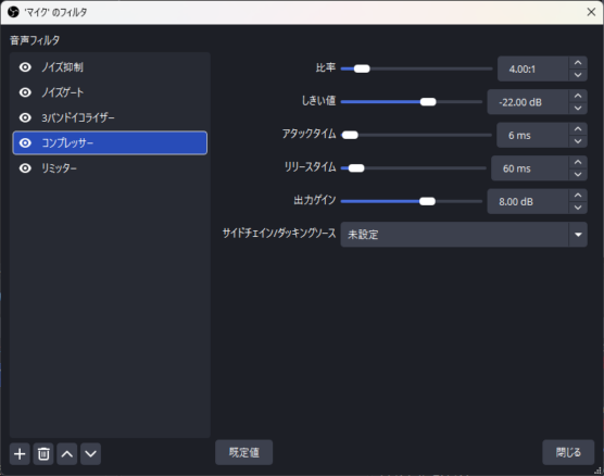 【結論:OBS音声フィルタ設定値】